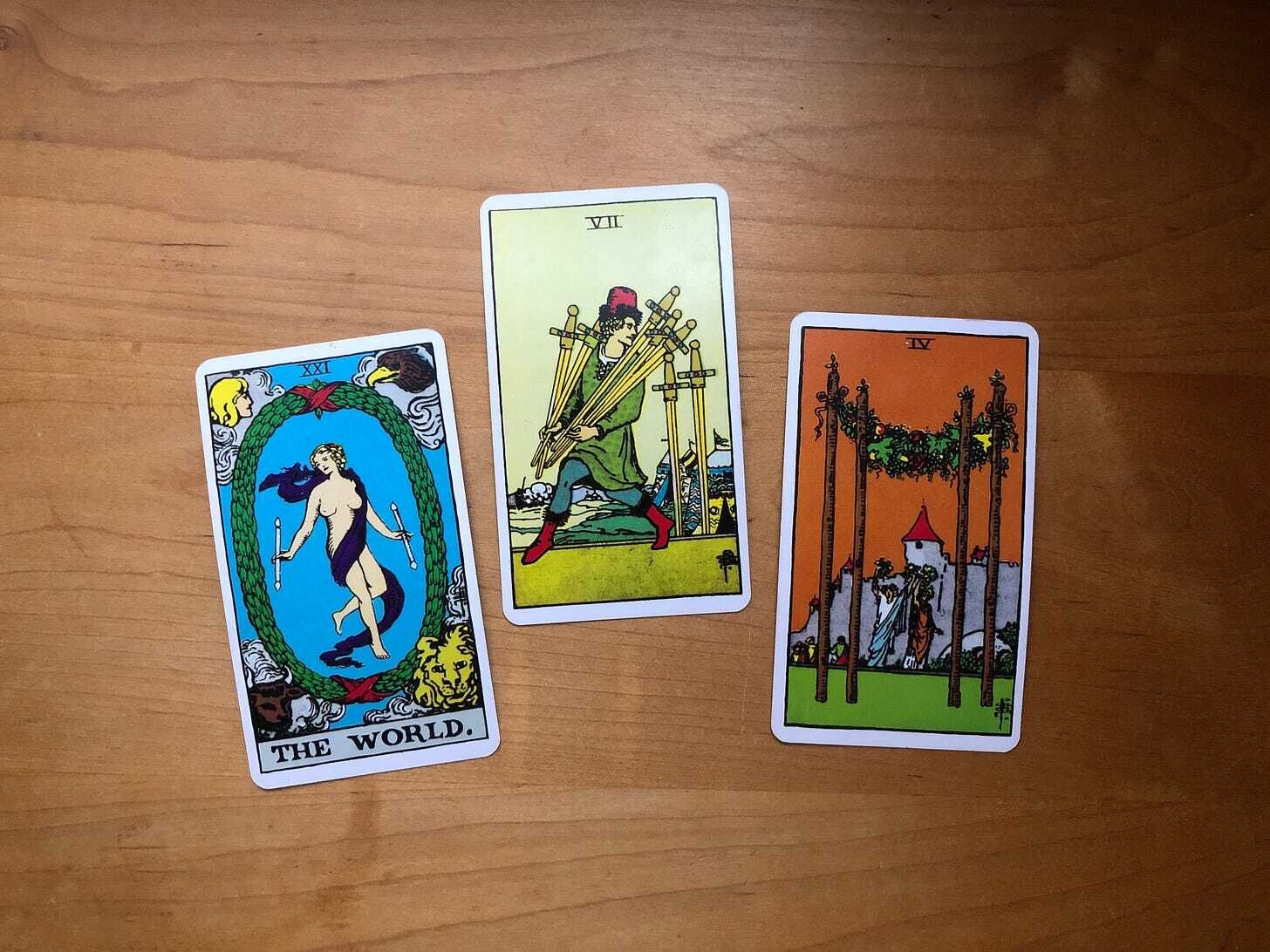 I love the body language in this tableau. We see the person in the Seven of Swords running towards The World, swords in arms, as if going to puncture that beautiful picture with thoughts, fears, and interpretations. Yet they’re looking over their shoulder at the Four of Wands as if they’re yearning to go there instead. This is the course correction we should take this week; moving away from criticism and towards the freedom and opportunity we’re building.
