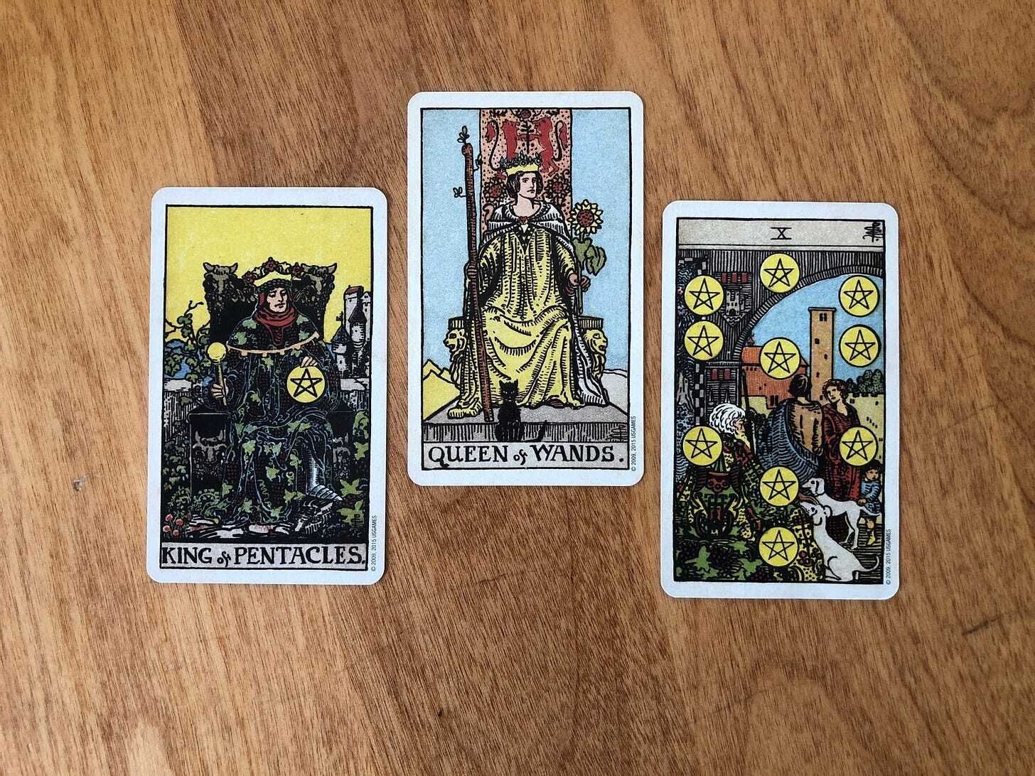 I often bristle at analogies centering around marriage with all of its associated power dynamics and gender roles, but sometimes it just works. Here, we have a potent coupling of The King of Pentacles and The Queen of Wands: Earth, stability, and physicality combining with fiery energy, dynamism, and creativity. What happens when we bring both of these approaches to our lives? We end up in the Ten of Pentacles, a card bursting with vitality. Chaotic, yes, but gloriously beautiful. A life well-lived is complicated, bustling, and a lot to maintain. Ultimately, however, it sustains us and brings incredible richness. Not just the material side of the pentacles suit, but the spiritual as well.