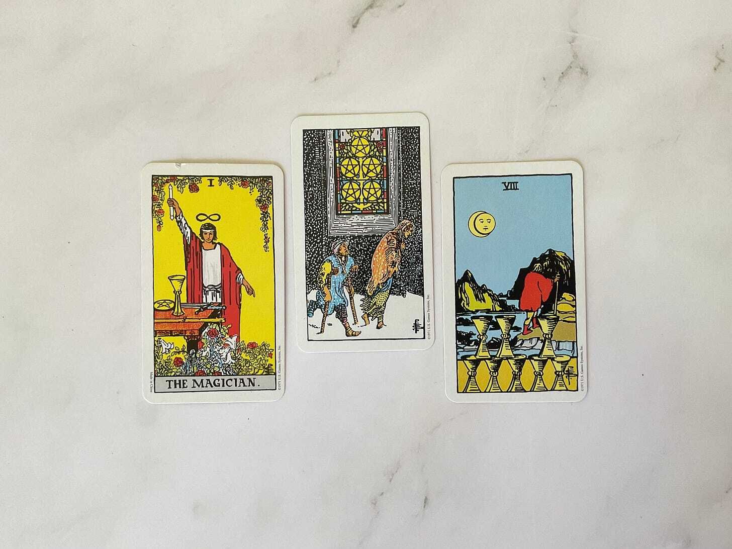 Returning to the theme of healing, I’m also noticing how the snow - frozen water - in the Five of Pentacles turns into the river in the Eight of Cups. Feelings becomes unstuck this week through experiencing or witnessing suffering, lack, or hardship. It may be a particularly tender time, so make room for this however works for you. The Magician may serve as inspiration here, too. How can you channel your emotions into art, expression, or action?