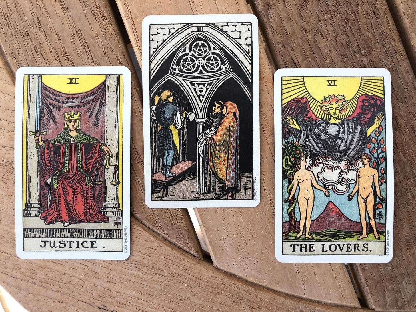 Tarot continues to fascinate me after all these years because it’s always changing. I can’t tell you how many three card readings I’ve done in my personal practice and professional career. It’s probably in the thousands at this point. But in all that time, I can’t recall this particular combination coming up, with its unique blend of the abstract (Justice) leading into the concrete (Three of Pentacles) and then into Edenic wildness (The Lovers).
