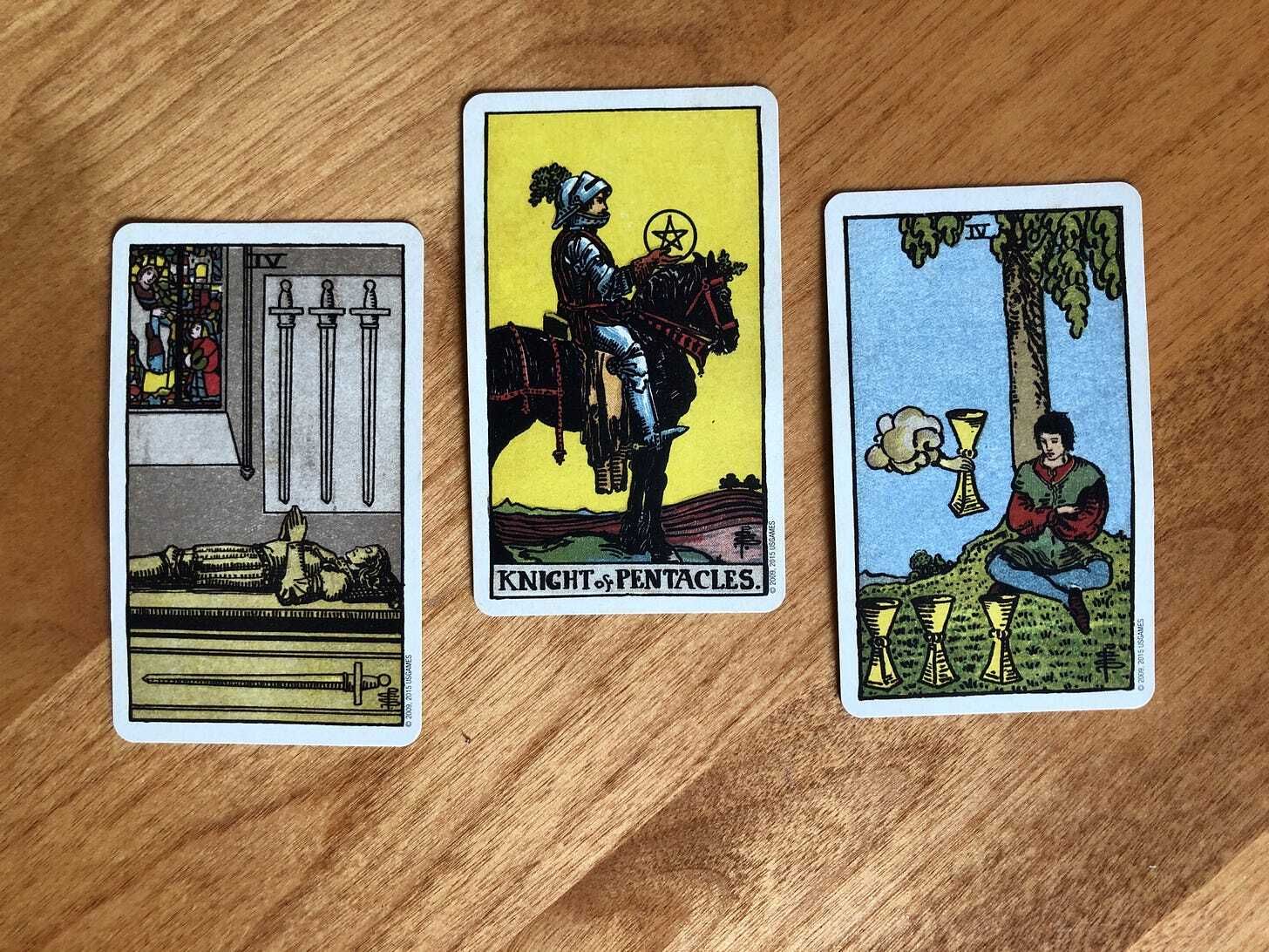 We have two fours in our reading, one on either side of the Knight of Pentacles. I find this intriguing since this number deals with the theme of structure. If we’re to follow the Knight’s path towards the right (the direction of “the future”), we move into the territory of the Four of Cups. So, a move from intellectual structure to emotional structure is taking us towards our goals. Scary! It can sometimes feel as if we’re abandoning logic and reason, the security of the easily-explainable, when we undergo this type of transition. Yet for anything to last, we need to have a deeper meaning animating it, and that’s what we’re striving for this week. Thankfully, we have the practical and methodical Knight of Pentacles undergirding this shift: What happens if you value the feelings brought up in your quest to build something as the important breadcrumbs leading you to the future, innovation, and fulfillment?