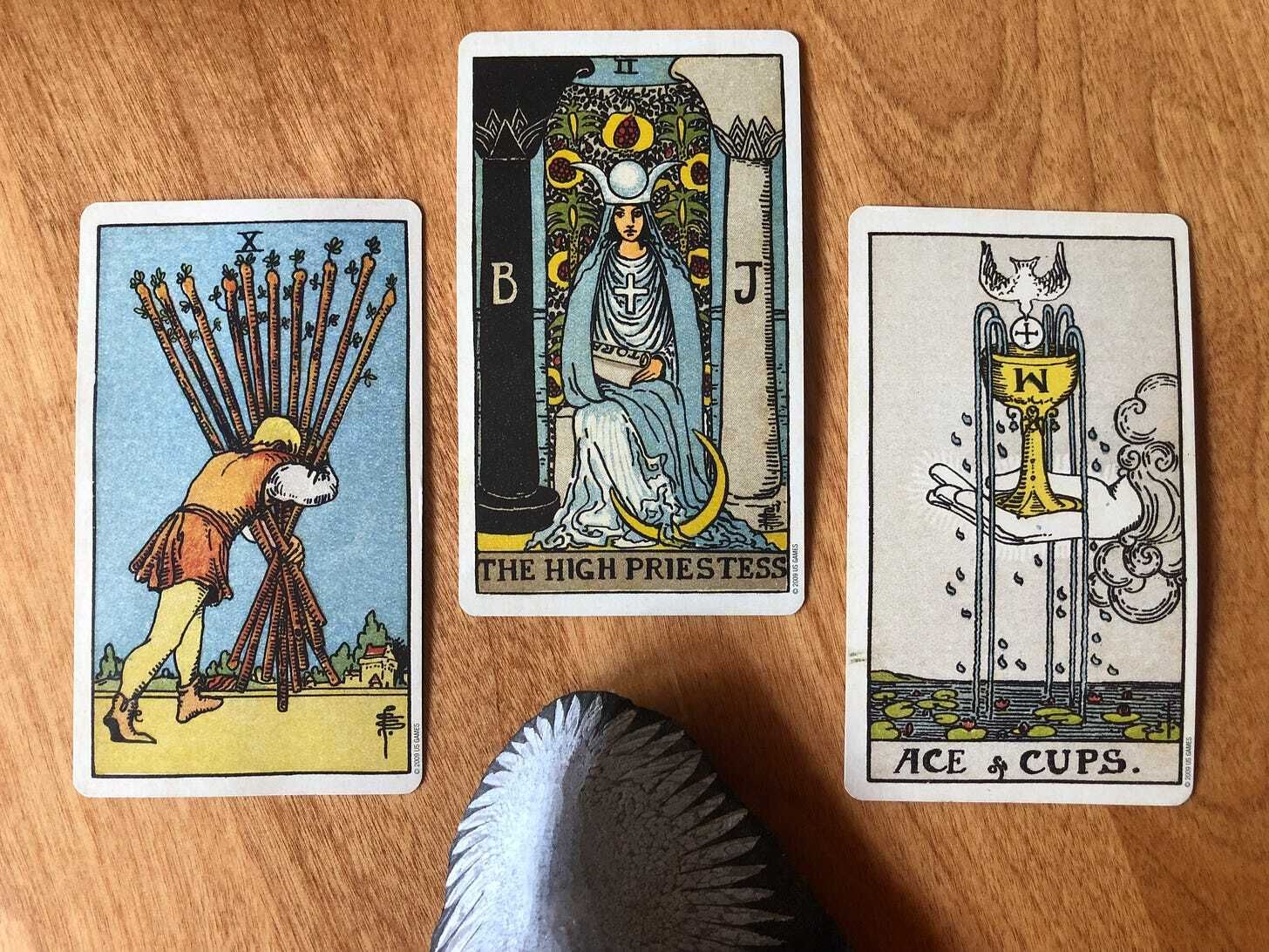 The Ten of Wands is all about bearing burdens, yet as a Minor Arcana card it speaks to the realm of the everyday. And we all know how many burdens can be found there. Where then, can we go? The High Priestess has the answers.