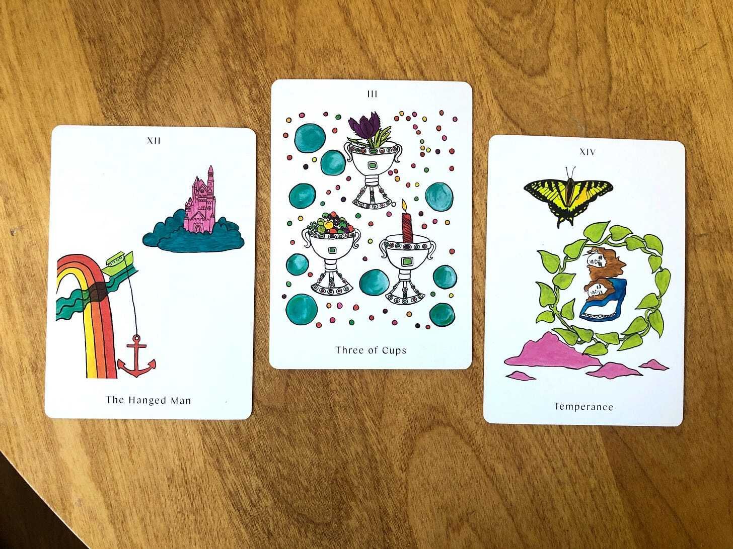 Our final card, Temperance, really highlights this approach. Finally, we have a reading that focuses on themes of softness and moderation! Following the path of The Hanged Man, in other words, is depositing us in a place of Temperance. Now that sounds like a sustainable and long-lasting solution to me. No extra striving, no difficult Minor Arcana cards that show us distracted by details; we’ve integrated something big, now we can rest.