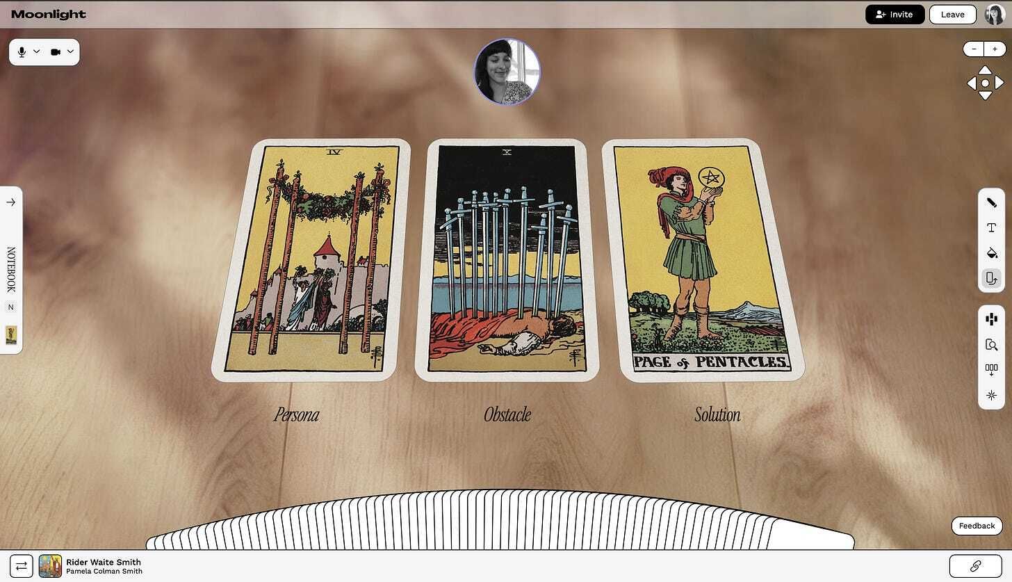 Moonlight is a new, gorgeous, and satisfyingly functional platform built just for tarot readings. I used it to draw the cards for our Weekly Forecast so you can get a sense for it below. You can still me in video as I emphatically react to your cards and you get to see your full spread laid out before you. It’s quite amazing, I have to say, and I’m excited to start reading for lovely people such as yourself.