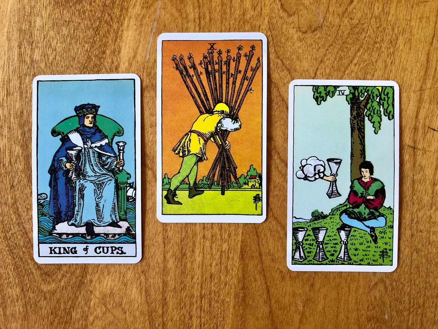 Our final card may have some clues as to why we’re tempted to keep going and run ourselves ragged, because on the other side of those sticks is… a tree? A meadow? Some boring ass cups? Admittedly, it’s much more engaging (and easier to talk about) when you’re busy and grappling with a whole bouquet of wands. Action keeps us from our thoughts and feelings, and this week we may be tempted to use a full schedule to keep us from our inner life. Yet even though the Four of Cups captures the flat expanse of boredom, it also shows its magic and potential. Towards the end of the week we may be surprised that our efforts under the King of Cups’ guidance haven’t yielded definitive answers. This is a time to embrace slowness, deliberation, and waiting for the right moment.