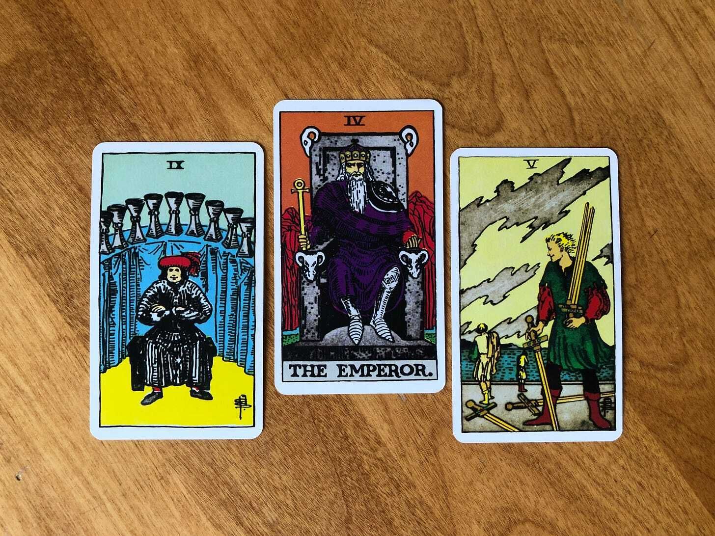 Well, firstly, I’ve been seeing a lot of swords cards appearing lately as a representation of pushback to growth. Because these cards focus on the mind, we can read them as manifestations of thoughts, beliefs, and orientations that begin within. Once we listen to these thoughts and accept them, they gain power which can ultimately influence our actions. This week, we’re seeing how having abundance (the Nine of Cups) and using it to fuel our growth (The Emperor) is inspiring either ourselves or others to do some dastardly swords-work: using words or even action to undermine our progress.