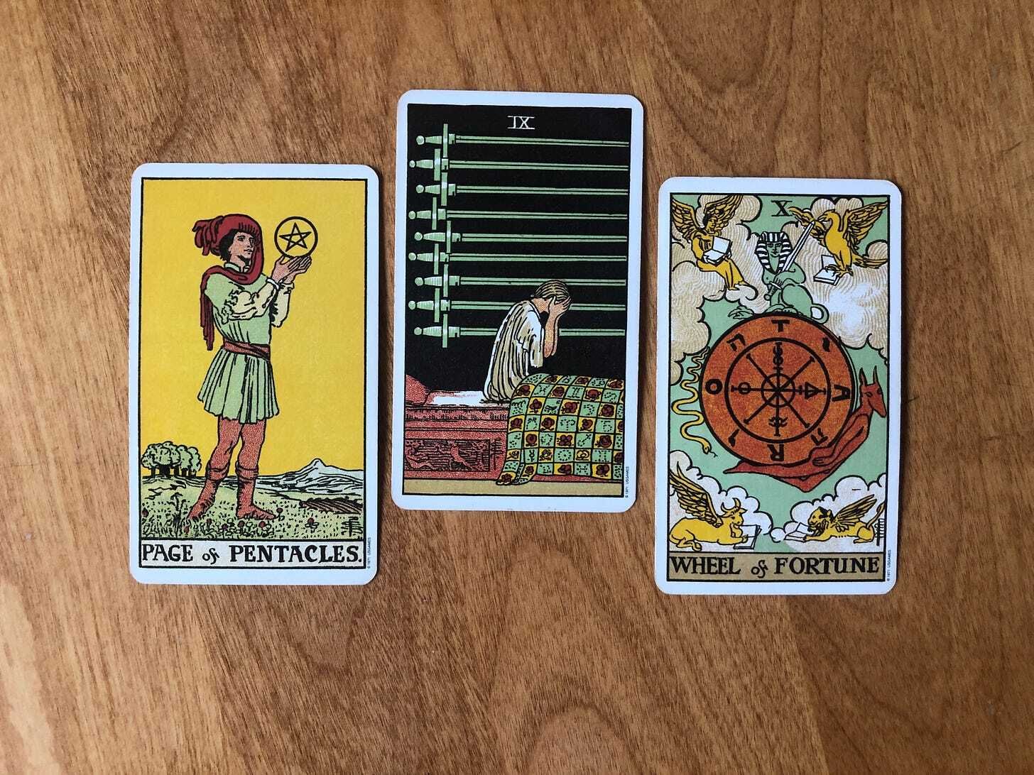 What does this all mean for us? To put it plainly (and how I’ll be framing this for myself) is that this week is giving us a wonderfully safe space to process our feelings. Some of this may even be springing from all the excitement and growth happening in the Page of Pentacles. New plans and interests can signal a shift away from old ways of being, and the Nine of Swords shows a moment of reckoning with what has hurt us in the past or has been hurtful to leave behind for whatever reason.