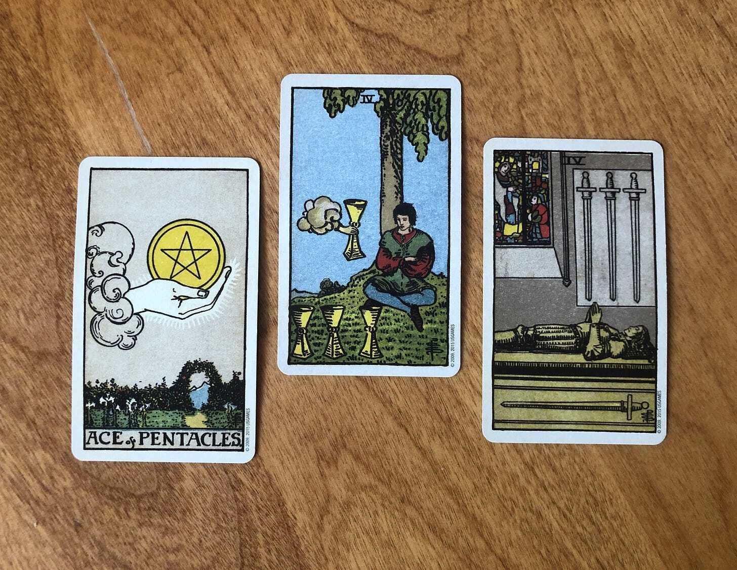 Ha! What a spread. My first impression is that this is a gentle reading. When I first turned over our beginning card, the Ace of Pentacles, I did get a little worried, wondering if my statements about this being an introspective season were off-base. But our following two cards are deeply, enduringly meditative, and oddly, I’m leery of bright and bold energy right now. Left alone or followed by more energetic cards, I’d find the Ace of Pentacles a little confrontational. This week, however, we’re being gifted with a long moment to integrate a new offering.
