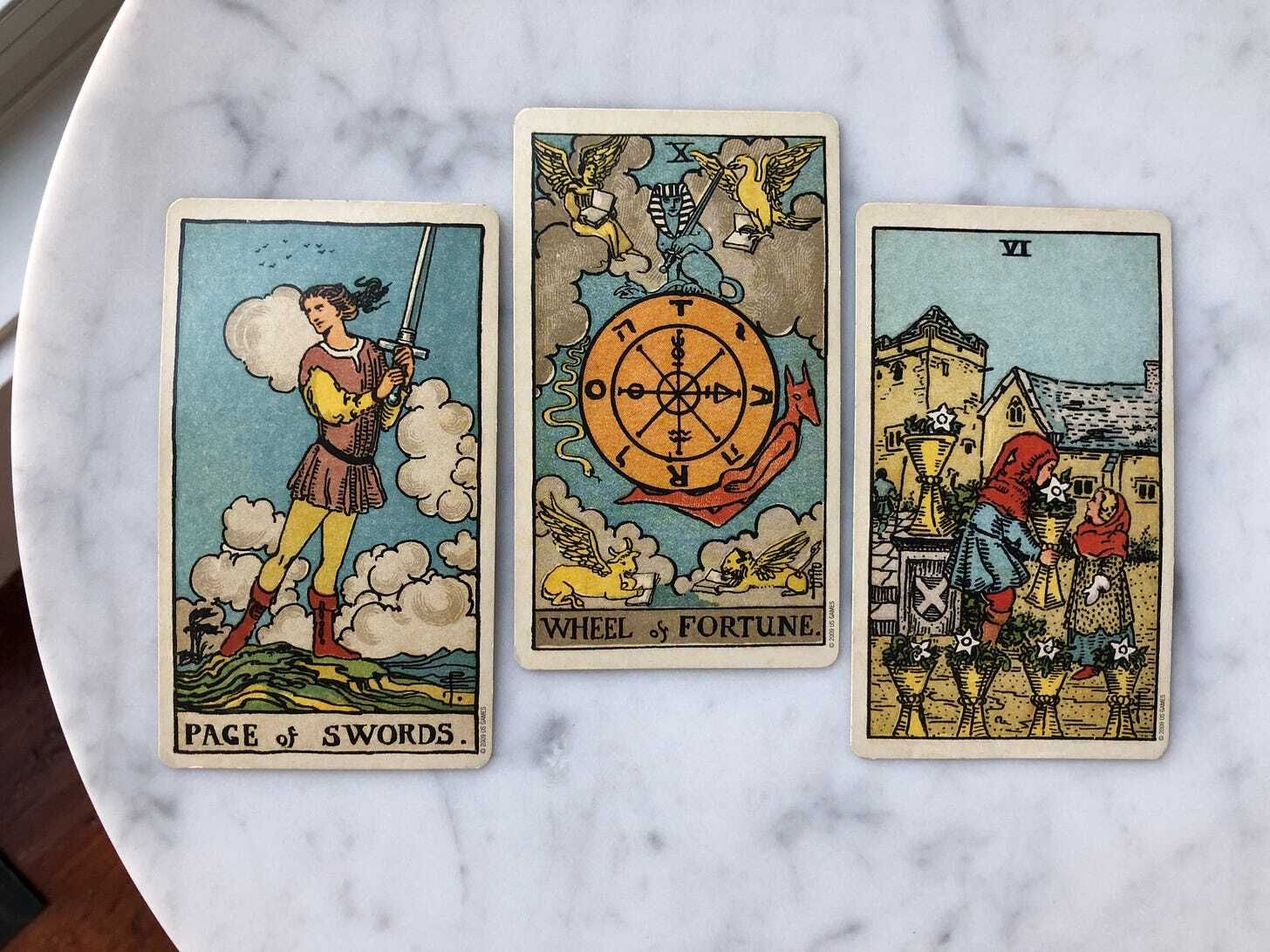 We may feel the same way this week. The Wheel of Fortune is a powerful card that mixes everything up. The usual guideposts get replaced by a confusing, esoteric swirl. We have to rely on our wits, be curious and creative like the Page of Swords. But when we come in from our wanderings, we enter into our final card, the beautiful and tender Six of Cups. All sixes in tarot deal with themes of balance, so while the cloudy tumult in the Page of Swords and Wheel of Fortune may feel destabilizing, we can always return from the larger circle of change - the wheel - and into the smaller circle of connection, the Six of Cups.