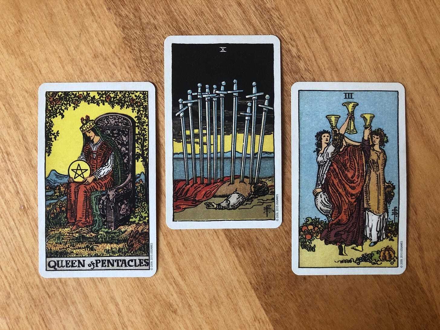 If you’ve been around here a while, you’ve likely noticed that each reading has a unique flavor. There are cards that form a harmonious community, cards that show a distinct, linear narrative, and cards that show different areas of our life coming into relationship (or conflict) with each other. Our reading for the week is the third type, as we find our swords-driven experience of life reaching a painful culmination. At first glance, it’s as if the Queen of Pentacles and Three of Cups are supporting characters, representing ways through which we can find comfort and relief in hard times. This may be true, and I’m also feeling something a little different, a little more subversive. What if our acts of self-care and our supportive communities are leading to and enabling a painful realization? And, more importantly, what if this is an absolutely wonderful development?
