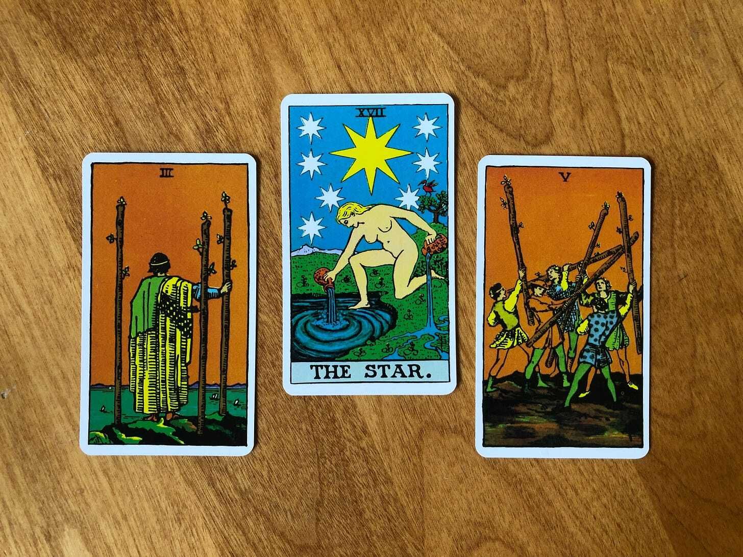 Occasionally, a five will give us a choice: to proceed or abandon our path and plans. Readings can be vague here - it’s up to us! But this week is different and I feel confident saying that whatever challenges the Five of Wands represent are worth pushing through. In fact, they’re signs that we’re on the right track. Backed by The Star and the Three of Wands, we have more than enough focus and wisdom to navigate whatever the Five of Wands gives us.