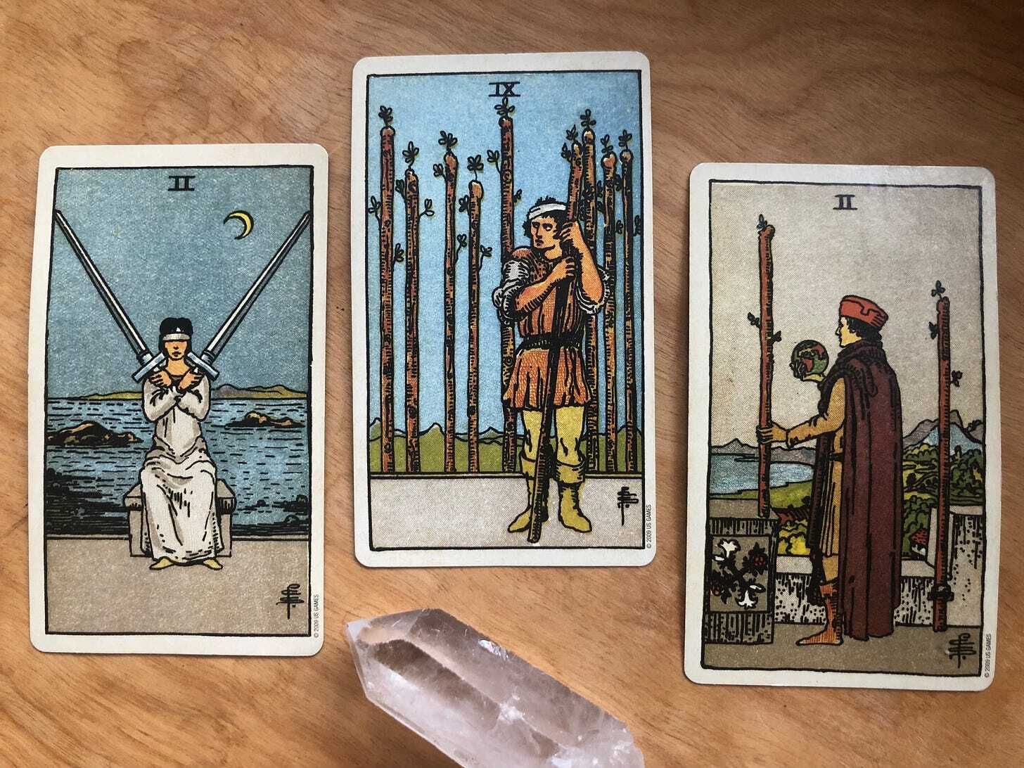 I’m seeing this reading as a pyramid instead of a line, with the Two of Swords and Two of Wands pushing up the Nine of Wands. Going back to the basics is giving us a much needed breather. Just keep an eye open at the end of the week for some refreshing inspiration.