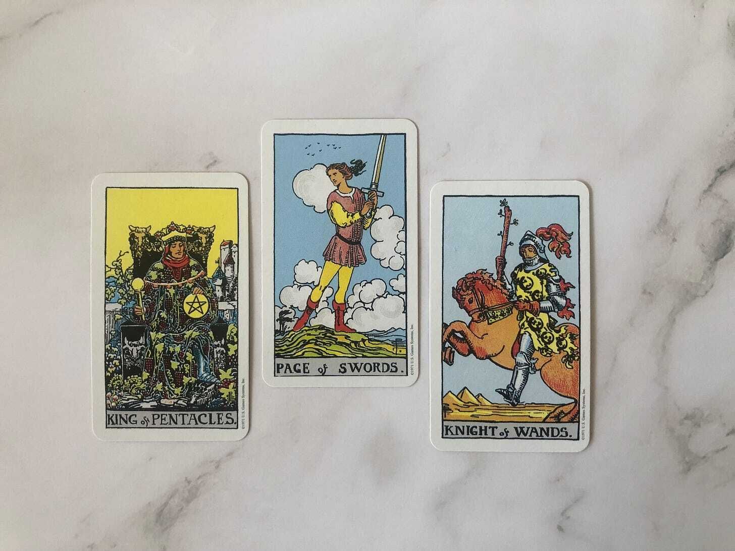 Right now, we’re working with a lot of swirling energy. This week specifically we’re engaging with themes of stability and wealth (King of Pentacles), intellectual curiosity and innovation (Page of Swords), and the urge to jump into action (The Knight of Wands).